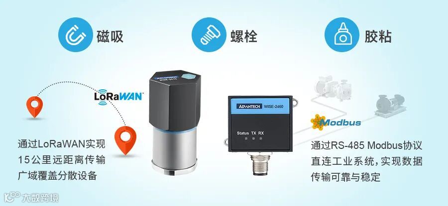 通过磁吸/螺栓/胶粘等方式,安装时间压缩,彻底告别复杂布线。WISE-2410凭借LoRaWAN实现15公里超远传输与建筑穿透,广域覆盖分散设备;WISE-2460通过RS-485 Modbus协议直连工业系统。二者经WISE-6610网关可无缝融入SCADA现有工业系统,减少IT基础设施投入。