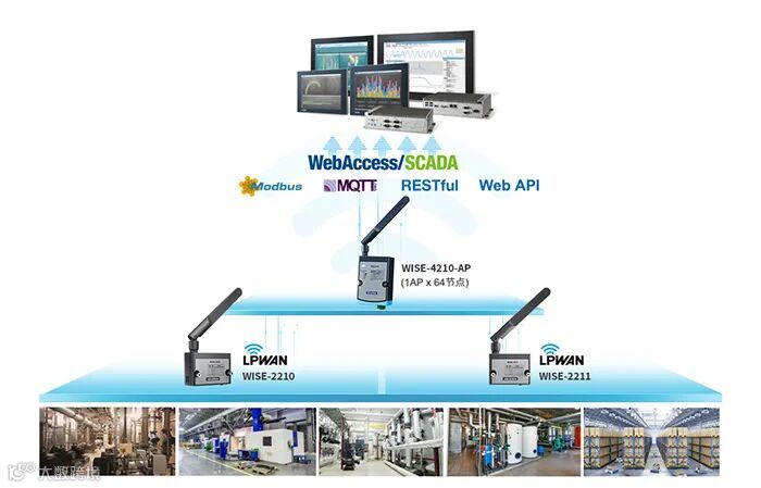 WISE-2210/2211与WISE-4210-AP协同工作,形成了一套从设备到云的整体解决方案 。方案支持Modbus、MQTT及RESTful web API协议,可更便捷地将相关数据更新到数据库、SCADA或云平台,同时减少人力投资。将数据从WISE-2210/2211节点传输到WISE-4210-AP,可同时管理多达64个节点——这极大地降低了关键基础设施的管理难度,并最大限度地减少总安装空间。