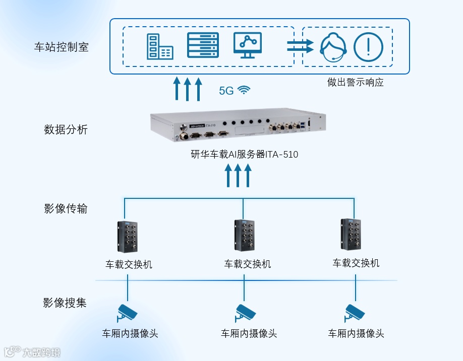 国内某线路地铁采用研华ITA-510作为其智能化列车的前端分析预处理单元。通过安装在车厢内的感知摄像头,实时采集高清图像视频数据,通过ITA-510强大的AI算力,进行前端图像视频的预解码分析处理,利用计算机视觉技术和图像处理算法来识别车厢内的实时拥挤状况。再将结果数据传输到车载服务器进行分布、处理,最后通过车地的超高速通讯将处理数据上传至云平台,来实现车站客户端的应急联动和乘客流量引导等精细化调度作用。