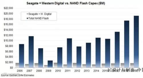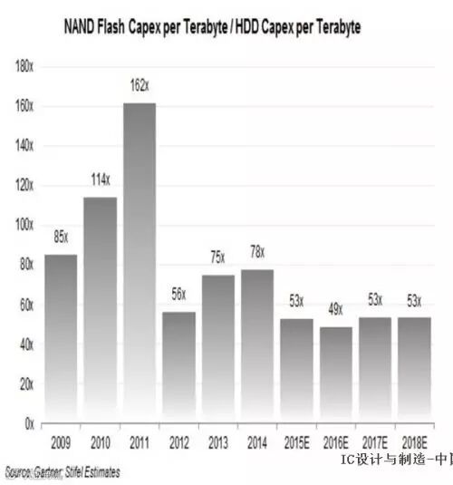 传统硬盘成本仍有优势 我在去年10月份也参观了美光公司于新加坡的制造工厂。美光今年2月又花费40亿美元用于扩大这家工厂的制造产量。相比之下,希捷与西部数据作为传统硬盘的代表,在过去三年中的总体资本支出约为43亿美元。国外研究机构利用电子表格建模生成了以下图表,具体内容为至2018年NAND与希捷/西部数据磁盘驱动器的资本支出对比结果:二者的差异可谓非常明显,特别是在闪存与磁盘的每TB资本支出数字对比方面。从不同年份出发,闪存的每TB制造成本与磁盘驱动器相比一直在53倍到162倍之间浮动。