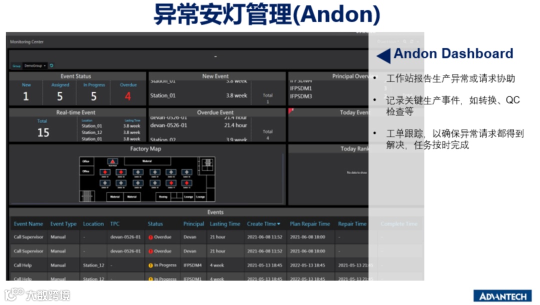 发现生产问题 ,通过OEE和Andon发现问题,监督机台稼动率,工单效率管理等。 -