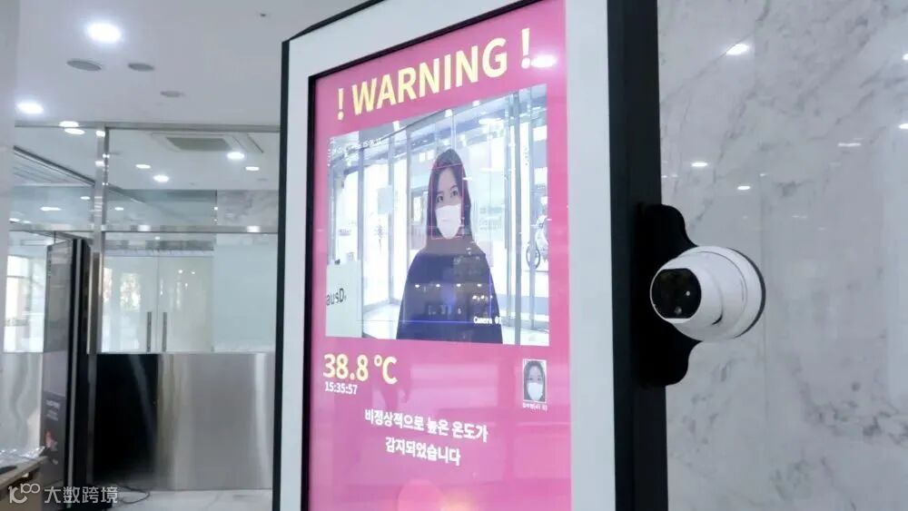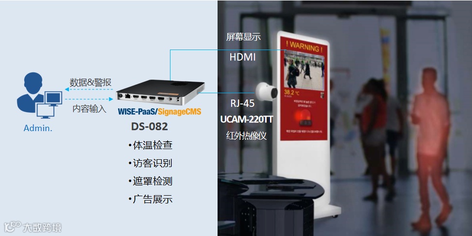 人工智能和大数据技术逐渐被用于管控新冠病毒的传播。韩国著名系统集成商SQISOFT集成了带有面部识别功能的数字标牌播放器和红外热成像摄像头的自助服务终端系统,可以进行非接触式体温测量,同步显示广告及安全通知。通过采用研华DS-082超薄4K数字标牌播放器和UCAM-220TT红外热成像相机,该系统能够检测访客是否佩戴口罩,可同时监测多达30人。