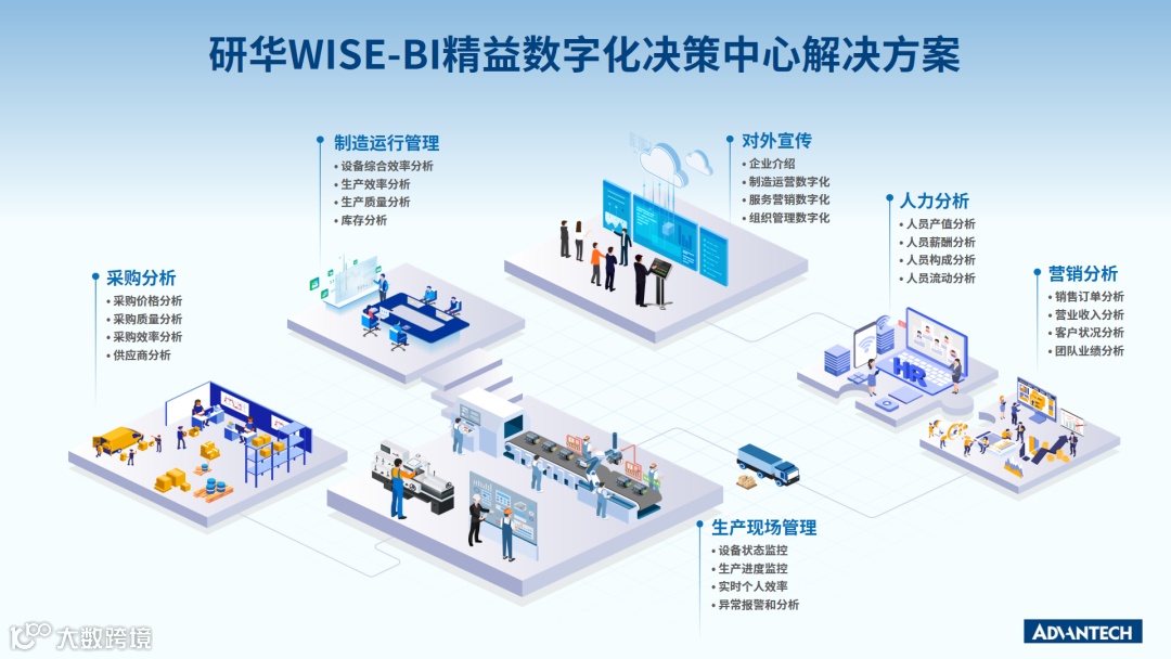 本期为大家推出WISE-BI精益数字化决策中心解决方案。研华WISE-BI,专注于生产制造业研、产、供、销、服等全业务流程的数据分析,深度挖掘制造业运作场景中沉淀的数据资产,助力制造企业以数据驱动科学决策,提升生产制造各环节的敏捷化,打造新的行业竞争力。