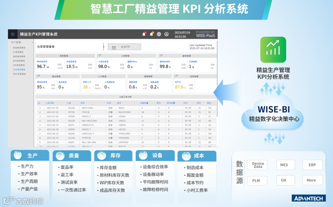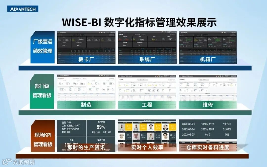 通过引入研华WISE-BI精益数字化决策中心解决方案,建立智慧工厂精益管理KPI分析系统,涵盖了几乎所有生产管理要素的数字化指标,提升了生产运营管理效率,达到了精细化生产目的,通过指标驱动不断提升工厂的运营绩效。