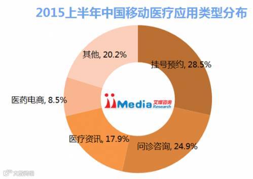 iiMedia Research数据显示,2015年上半年,中国移动医疗应用类型主要为挂号预约类、问诊咨询类、医疗资讯类,分别占比28.5%、24.9%以及17.9%。