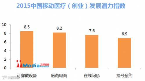 iiMedia Research数据显示,在2015中国移动医疗(创业)发展潜力排行中,可穿戴设备排名第一,医药电商排名第二,在线问诊和挂号预约紧随其后。