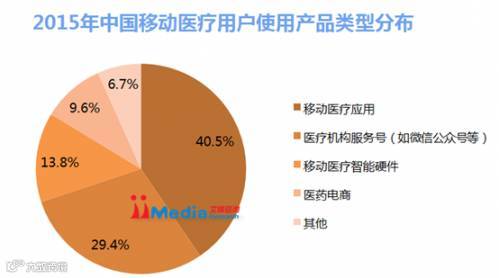 iiMedia Research数据显示,在目前的移动医疗产品当中,移动医疗应用使用率最高,为40.5%;其次为医疗机构的服务号,占比29.4%;智能硬件和医药电商的使用率相对前两者偏低。