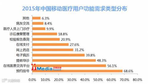 iiMedia Research数据显示,在功能需求上,68.6%的移动医疗用户选择预约挂号为主要需求;56.1%的用户则认为移动医疗有助于搭建在线医患交流平台。