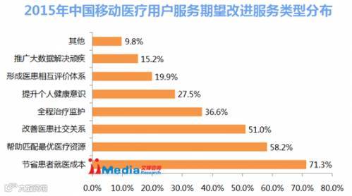 iiMedia Research数据显示,71.3%的移动医疗用户希望通过移动医疗来节省就医的经济以及时间成本;58.2%的用户希望通过移动医疗帮助匹配到最佳的医疗资源;51.0%的用户则期望移动医疗能进一步改善医患社交关系。
