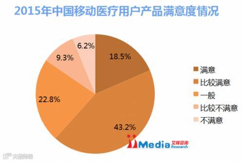 iiMedia Research数据显示,在移动医疗用户对产品满意度上,18.5%的用户表示满意,43.2%的用户表示比较满意。而仅有6.2%的用户在使用之后对移动医疗产品非常不满意。
