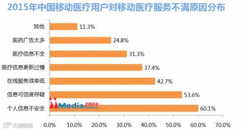 iiMedia Research数据显示,60.1%的移动医疗用户认为目前移动医疗服务对个人信息安全方面的保障不足;另外,平台信息可信度低、服务效率低也是用户不满的主要愿意,两者分别占比53.6%和42.7%。