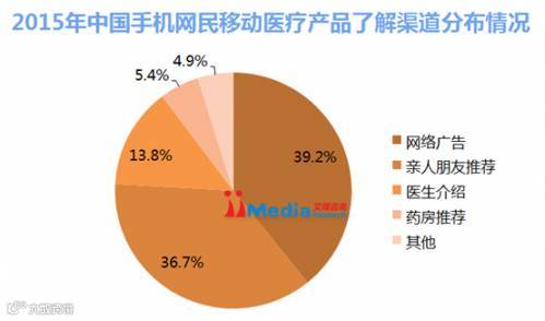 iiMedia Research数据显示,2015年,39.2%的中国手机网民通过网络广告了解移动医疗产品;36.7%了解移动医疗产品则是通过亲人好友推荐渠道。