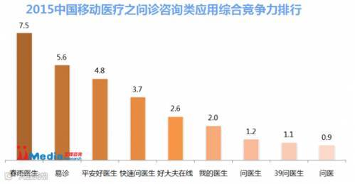 iiMedia Research数据显示,在中国移动医疗问诊咨询类应用综合竞争力排行中,春雨医生以7.5分排名第一;易诊以5.6分排名第二;平安好医生、快速问医生、好大夫在线位列3~5位。