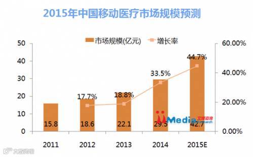 iiMedia Research(艾媒咨询)数据显示,2014年中国移动医疗市场规模达到29.5亿元。2015年中国移动医疗市场规模将达42.7亿元,增长率为44.7%。