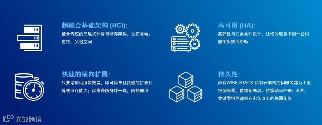 研华WISE-STACK不仅有其他私有云共同的优点——可靠安全、以及对庞大数据的处理能力,还有很多不可取代的优点,例如: