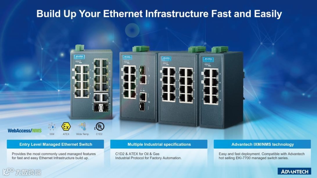 凭借着对工业物联网市场的专注与了解,自2021年起,研华科技正式宣布调整工业通讯产品线划分,新增入门级管理型以太网交换机产品线,将EKI-5500/56000系列重新划分为入门级网管型以太网交换机。