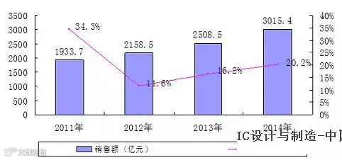 据中国半导体行业协会统计,2014年我国集成电路产业销售收入达3015.4亿元,同比增长20.2%,增速较2013年提高4个百分点。产业规模继续保持快速增长,各季度增速呈现前缓后高的态势。