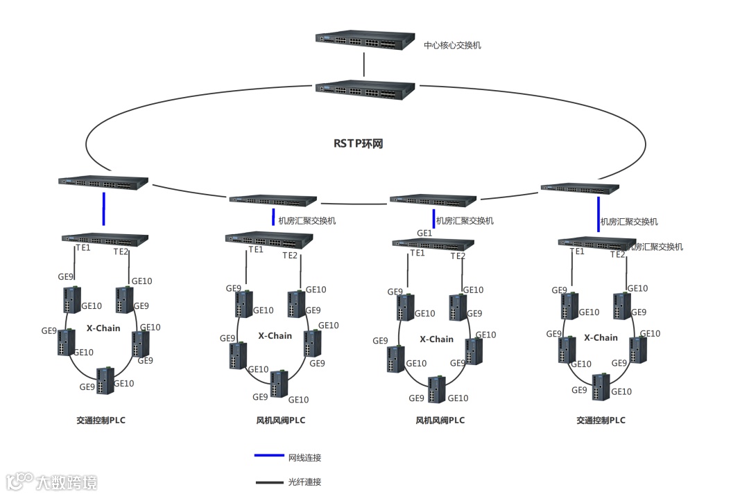 在太湖隧道的不同系统中,X-Chain分别将EKI-7712G之间彼此串连组网,接入现场四个机房内的核心交换机,最终接入中心交换机,从而形成整个隧道网络系统。隧道的部分系统则采用了通用协议RSTP,以便直接接入核心交换机组网。