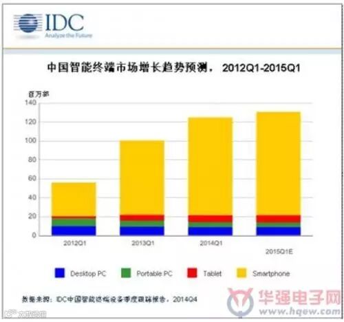 IDC中国研究经理张一磊认为,尽管2014年中国智能终端市场同比增长放缓,但2015年各个产品市场仍然有提振空间,预计2015年整体市场出货量将超过 5.5亿部,平板电脑和智能手机继续扮演拉动增长的主力,而传统PC产品将逐步摆脱寒冬。