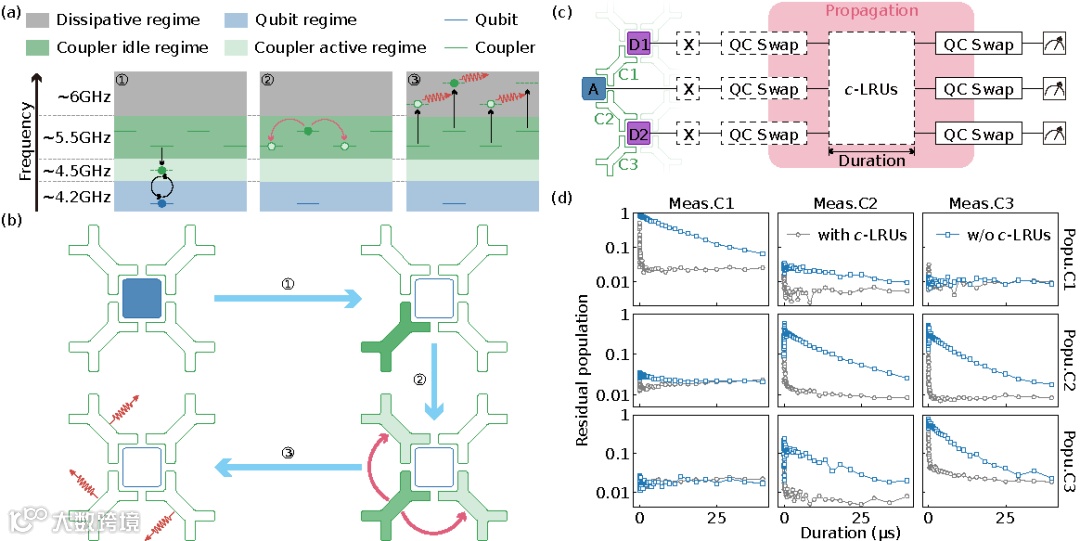 为了解决这一问题,研究人员提出了一种可调耦合器辅助的泄露抑制方案。该方案利用可调耦合器的强频率可调性,以及与芯片上品质因子较低的读取腔存在的杂散耦合,首先将耦合器频率调制到量子比特频率附近,再通过参数驱动信号将泄露能量转移到耦合器上,最后调制耦合器频率到读取腔频率构成的耗散区域,使这部分能量快速耗散到环境中。