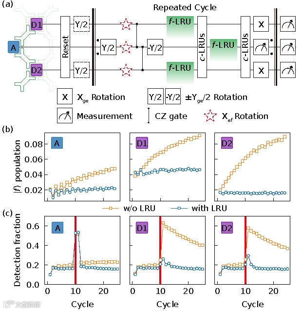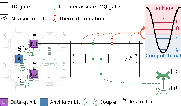 图1:多比特超导量子芯片上的量子纠错线路及态泄露途径