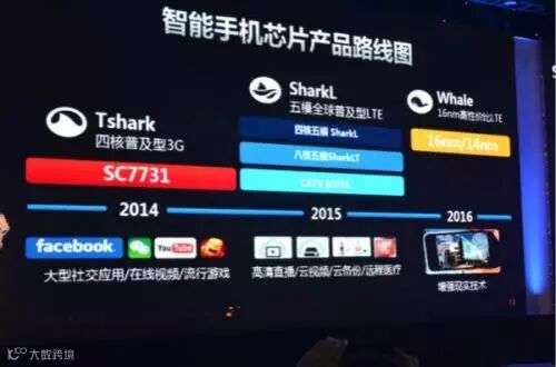 2015年,展讯将推出三款芯片(shark系列)。包括本次推出的SC9830A(sharkL)、以及后续将推出的八核五模的sharkT、同时展讯也将最后推出支持cat6的Sofia版本。至于2016年,展讯将推出非常高端的产品,与Intel合作推出14/16nm的whale,这将是一款足以让展讯弯道超车的产品。