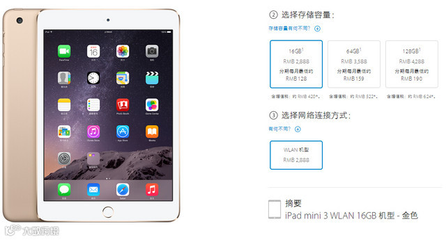 值得注意的是,苹果似乎有意保持和iPhone 6一样的格调,iPad mini 3依旧取消了32GB的版本直接从16GB跳跃到了64GB。在笔者认为,平板电脑和手机不同,小容量显然更是应该取消的配置,如果将32GB保留16GB取消,价格方面32GB调整为16GB的水平肯定更会受到大家的追捧。