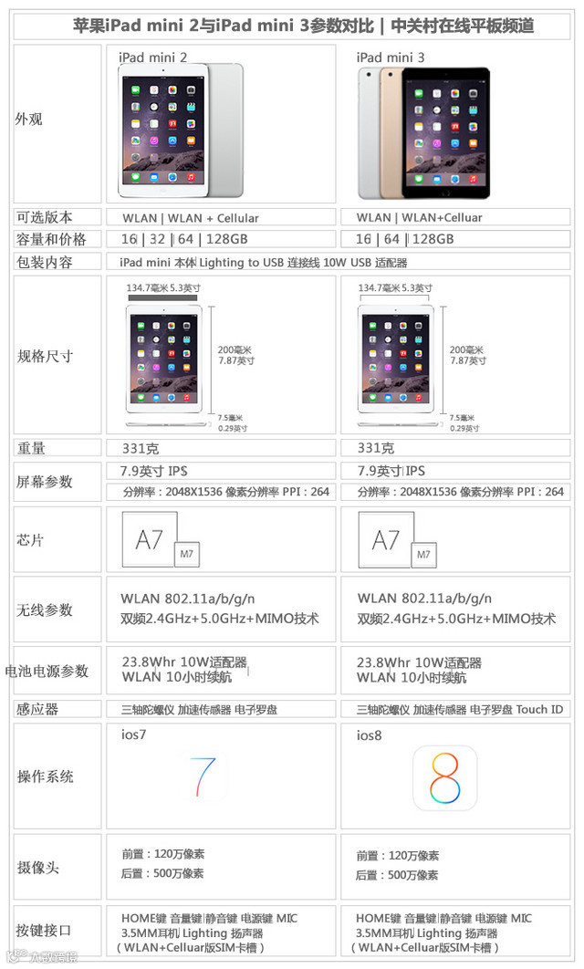 iPad mini 2与iPad mini 3参数对比