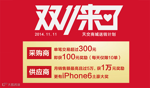 元器件交易网旗下的“天交商城”,通过对供应商和采购商的一系列返现奖励,更有iPhone 6土豪大奖,堪称“双十一”亮点最大的元器件电商平台。