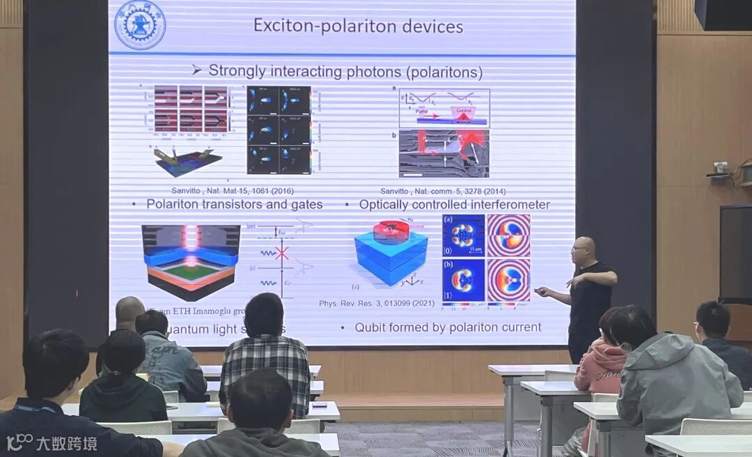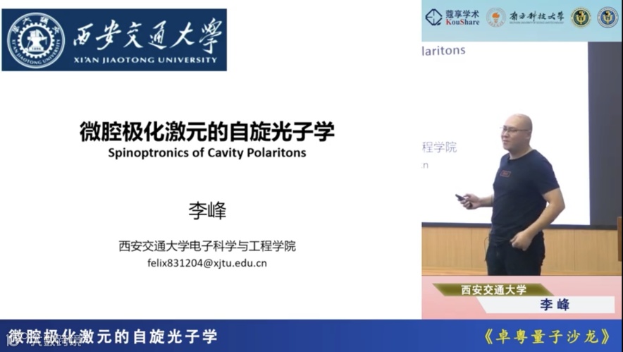 李峰教授的报告聚焦于微腔激子极化激元中自旋轨道耦合的相关物理学研究,首先讲述了微腔激子极化激元的基本概念、物理意义及应用前景,并介绍了极化激元自旋光子学的机理、概念拓展与研究现状。 随后,报告人讲述了研究团队近年来相关的理论和实验研究成果,包括约束体系下极化激元通过自旋轨道耦合形成的自旋涡旋本征态、简并斯格明子态及其非厄米调控方法,以及自由体系下,微腔与偏振各向异性激子材料相结合产生的宏观旋光性,并在此基础上观测到的非平庸拓扑能谷、极化激元能带上的非厄米奇异点与发散量子度规等有趣现象。最后,报告人还简要的介绍了研究团队在原子体系中量子光流体动力学模拟、稀土离子微纳米晶体发光偏振机理、弯曲微腔光子动力学方面的研究成果。