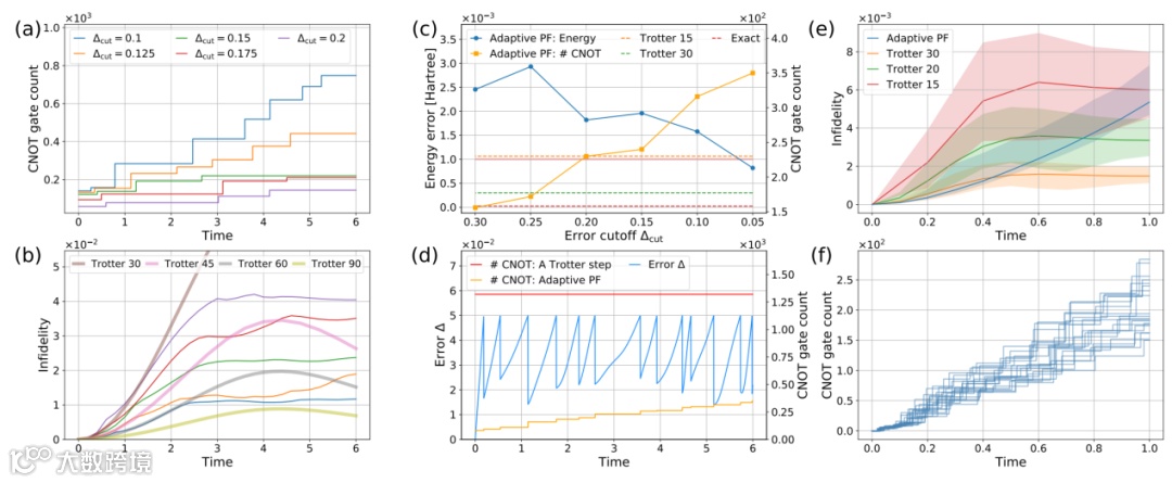 为了克服上述难题,该联合研究团队提出了一个自适应式的量子演化算法,可以通过测量演化过程中的量子态,自适应地构建用于模拟演化的线路。我们证明了在使用哈密顿量的子项的演化作为线路的构建模块的时候,我们的算法可以完成任意高的精度模拟。为了验证了我们的算法,我们使用了经典计算机数值模拟的方法。结果显示,与一阶Suzuki-Trotter公式相比,在保证模拟精度的前提下,该方法的线路深度(尤其是两比特门的数量)减少了约两个数量级。