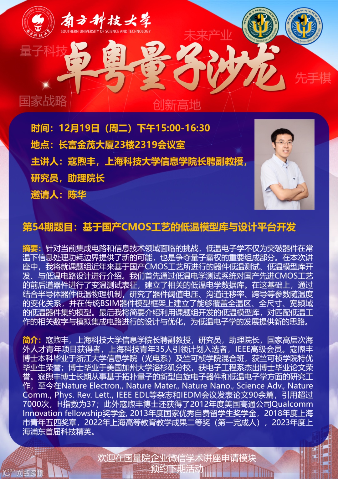 针对当前集成电路和信息技术领域面临的挑战,低温电子学不仅为突破器件在常温下信息处理功耗边界提供了新的可能,也是争夺量子霸权的重要组成部分。在本次讲座中,我将就课题组近年来基于国产CMOS工艺所进行的器件低温测试、低温模型库开发、与低温电路设计进行介绍。我们首先通过低温电学测试系统对国产先进CMOS工艺的前后道器件进行了变温测试表征,建立了相关的低温电学数据库。在这基础上,通过结合半导体器件低温物理机制,研究了器件阈值电压、沟道迁移率、跨导等参数随温度的变化关系,并在传统BSIM器件模型框架上建立了能够覆盖全温区、全尺寸、宽频域的低温器件集约模型。最后我将简要介绍利用课题组开发的低温模型库,对匹配低温工作的相关数字与模拟集成电路进行的设计与优化,为低温电子学的发展提供新的思路。