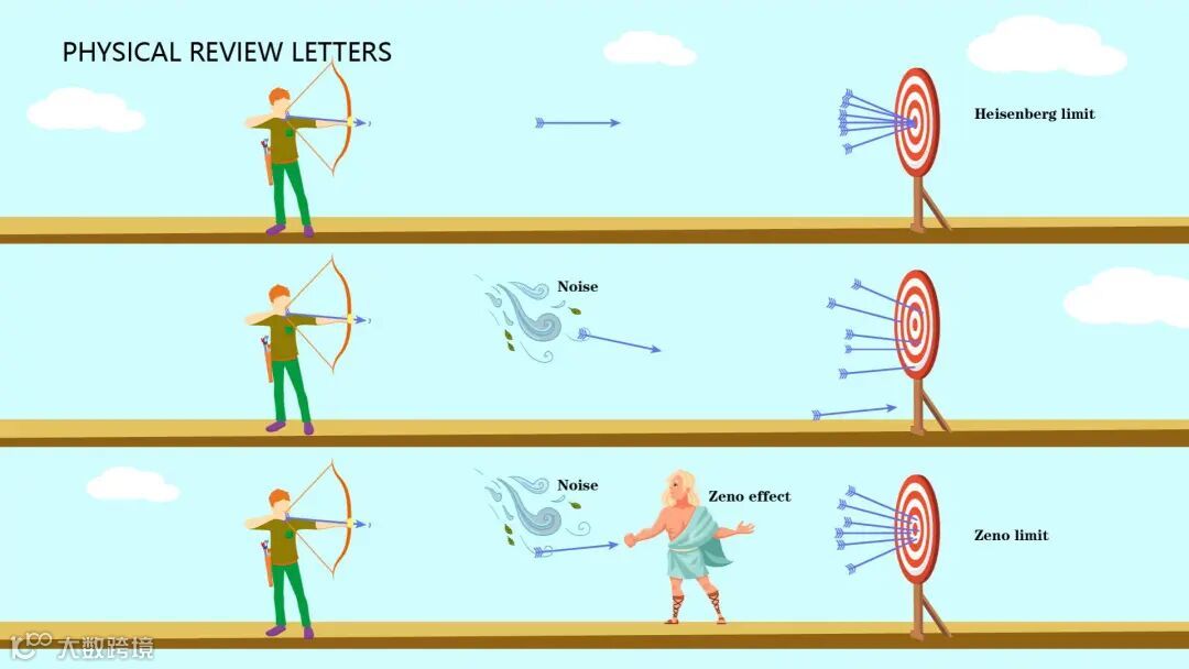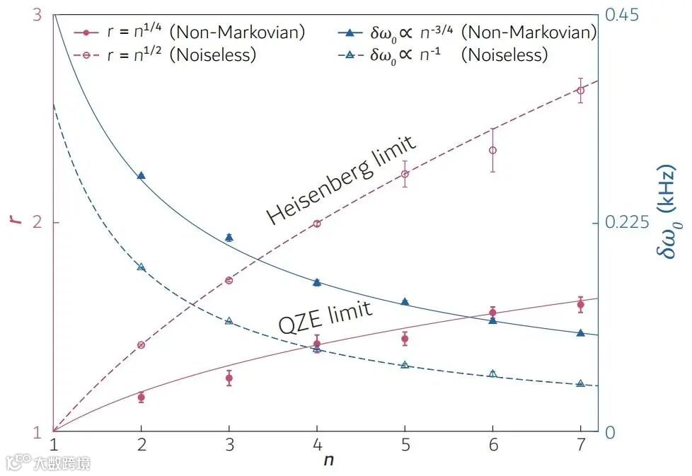 2012年,Chin、 Huelga和Plenio从理论上证明了纠缠探针在非马尔可夫噪声中可以超过标准量子极限的精度,达到n-3/4,这被称为芝诺极限。相比于标准量子极限n-1/2,芝诺极限带来了n1/4倍的精度提升,其关键思想是量子芝诺效应可以显著降低退相干误差。这在量子计量界具有重要意义,并引发了一系列后续理论进展,然而,该理论却还没被实验证实过。