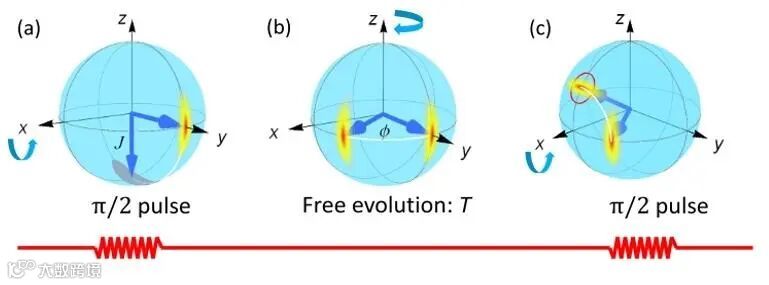 为了解决这两大难题,鲁大为团队采用量子模拟方法来调制噪声模型,并应用bath-engineering技术来模拟高精度的非马尔可夫环境。类似于经典的拉姆齐干涉,研究人员首先将初始态制备到叠加态,然后让其在经过时间调制的哈密顿量HSB (t)= ω0σz /2 +βz (t)σz下演化,其中βz (t)是随机误差。虽然单次演化依然是幺正的,但可以通过多次实验取平均值来模拟退相干。Bath-engineering的核心就是在初始的时候制备大量相同的初态,并让它们在不同的哈密顿量HSB (t)下进行一段时间的演化。由于每个初态感受到的进动频率不一样,它们最终积累的相位也会不同。将末态进行系综(时间)平均,理论上就可以模拟纯退相干环境。
