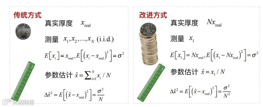 在古埃及时期,人们习惯用绳子来度量土地的长度。而在《史记》大禹治水中也有记载:“左准绳,右规矩,载四时,以开九州。” 这里“准”“绳”便是取平和取直的工具,而“规矩”则是用于测量高低远近的工具。随着科技的进步,人们对测量的要求已经由最初的粗略计量转变为如今的精密测量。在物理学上,测量是一种估计某一特定观测量(或物理参数)的物理过程。测量科学被称为度量学,而测量精度究竟是如何被提升的呢?我们以测量硬币的厚度为例,传统的方式是每次测量一枚硬币的厚度,重复测量N次。假设测量值的期望等于硬币的真实厚度(即无偏估计),那么最终测量厚度的标准差将正比于N-1/2。为了提高测量的精度,将测量方法改进为每次测量N枚硬币的厚度,重复测量N次后,测量值的标准差将正比于N-1。这相比于传统方法来说,测量误差降低了N-1/2。