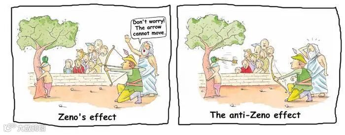在希腊神话中,阿喀琉斯是一位善跑的英雄。有一次他和乌龟赛跑时,因为他的速度比乌龟快10倍,为了公平起见,乌龟在他前方100米起跑,竞赛要求追者必须先到达被追者的出发点,当阿喀琉斯追到100米时,乌龟已经向前爬了10米,于是,一个新的起点产生了,阿喀琉斯必须继续追,而当他追上乌龟爬的这10米时,乌龟又已经向前爬了1米...... 就这样,乌龟会制造出无穷多个起点,它总能在起点与自己之间制造出一个距离,不管这个距离有多小,只要乌龟不停地向前爬,阿喀琉斯就永远追不上乌龟。这就是古希腊数学家芝诺提出的著名的“芝诺悖论”。当然,在量子世界中,并没有阿喀琉斯和乌龟赛跑。不过当量子系统演化时,频繁的观测会导致系统停留在原来的状态上,这与“芝诺悖论”有异曲同工之妙,也被称为量子芝诺效应(Quantum Zeno Effect)。当然,还有与它相反的版本,频繁观测可以加速量子系统的演化,即量子反芝诺效应(Quantum Anti-Zeno Effect)。