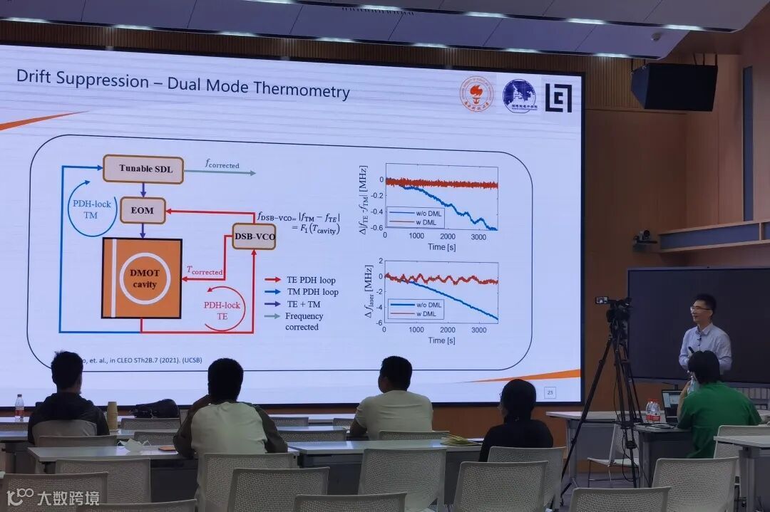 随后,报告着重介绍了适用于Pound-Drever-Hall锁频方法的片上集成光学参考腔的设计思路和研究方向,包括利用超低损耗波导提升谐振腔的Q值,利用复合材料补偿谐振腔的等效热光系数或等效热膨胀系数,使用主动补偿的方式稳定谐振腔的腔体温度等,并讨论了目前片上集成光学参考腔的性能瓶颈和可能的制约因素。