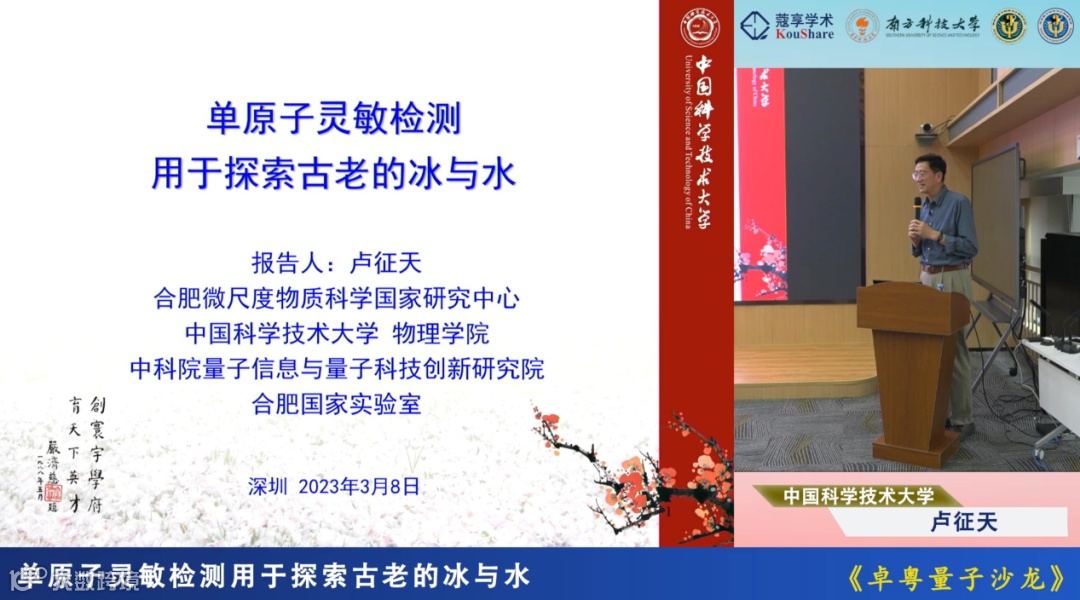 2023年3月8日下午,量子科学与工程研究院党委在量子研究院518报告厅举办了第35期卓粤量子沙龙活动,本次沙龙邀请了中国科学技术大学的卢征天教授为研究院师生带来主题为“Identifying Old Ice and Water with Single-Atom Counting”(单原子灵敏检测用于探索古老的冰和水)的报告,本次沙龙的主持人为量子研究院俞大鹏老师和刘骏秋老师。