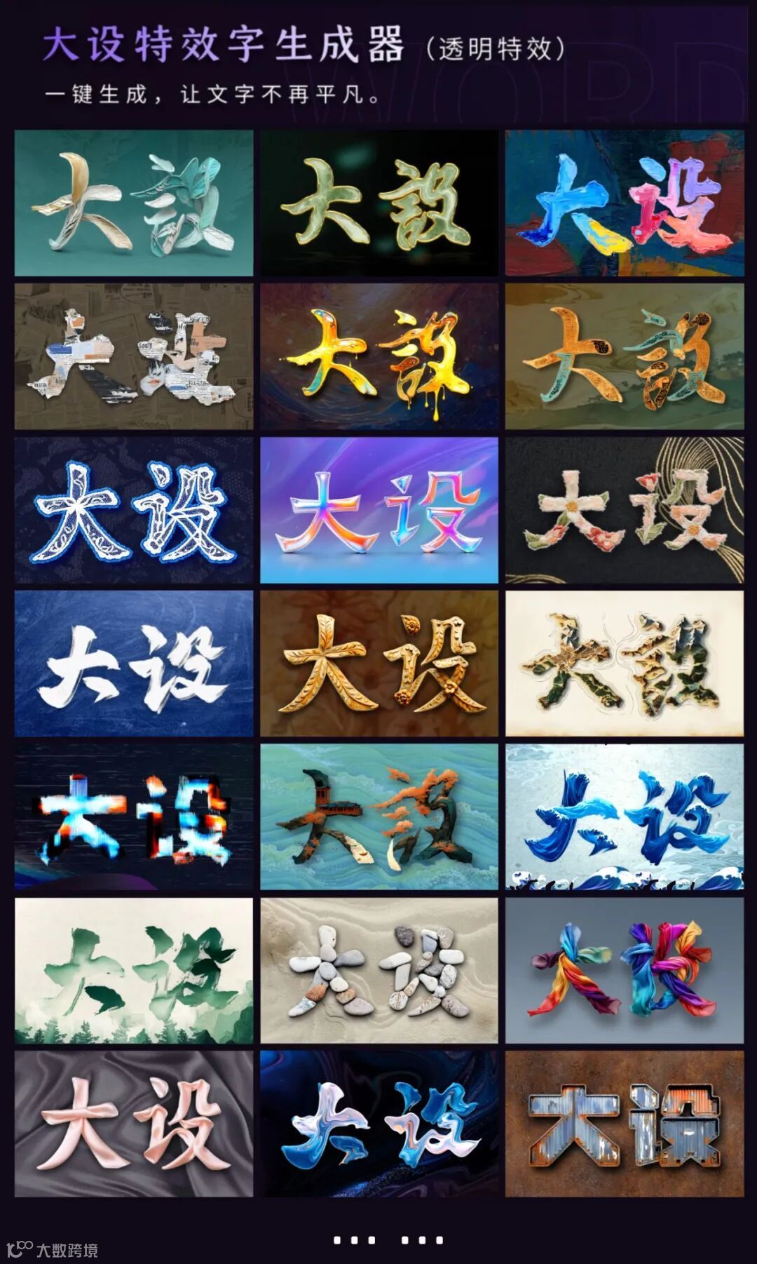 此外,大设特效字还可以与各种自然美景、抽象元素等相结合,创造出更加丰富多彩的视觉效果。