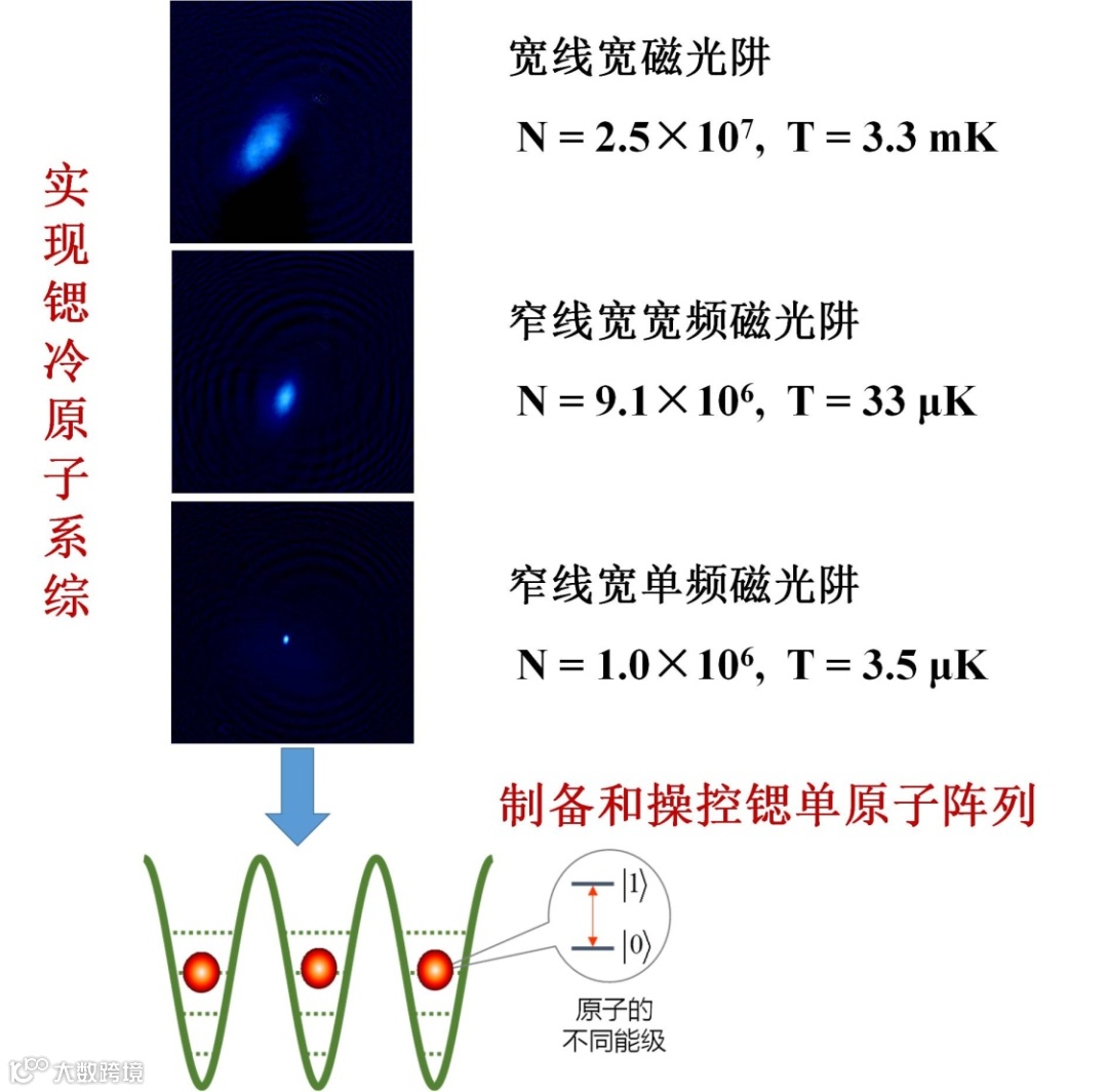 约3.3mK;2021年6月,实现三维磁光阱二级冷却,原子数目约1.0*10^6,原子温度约3.5μK;2021年8月,将光镊激光束强聚焦至束腰500nm,与冷原子团中心重合。目前,我们正试图在一个微型光镊中俘获一个Sr-88原子。后续,将依次实现玻色子Sr-88和费米子Sr-87单原子阵列,研究单量子比特操控、量子比特转移、谐振子运动态冷却、自旋交换碰撞、以及Rydberg态激发等。