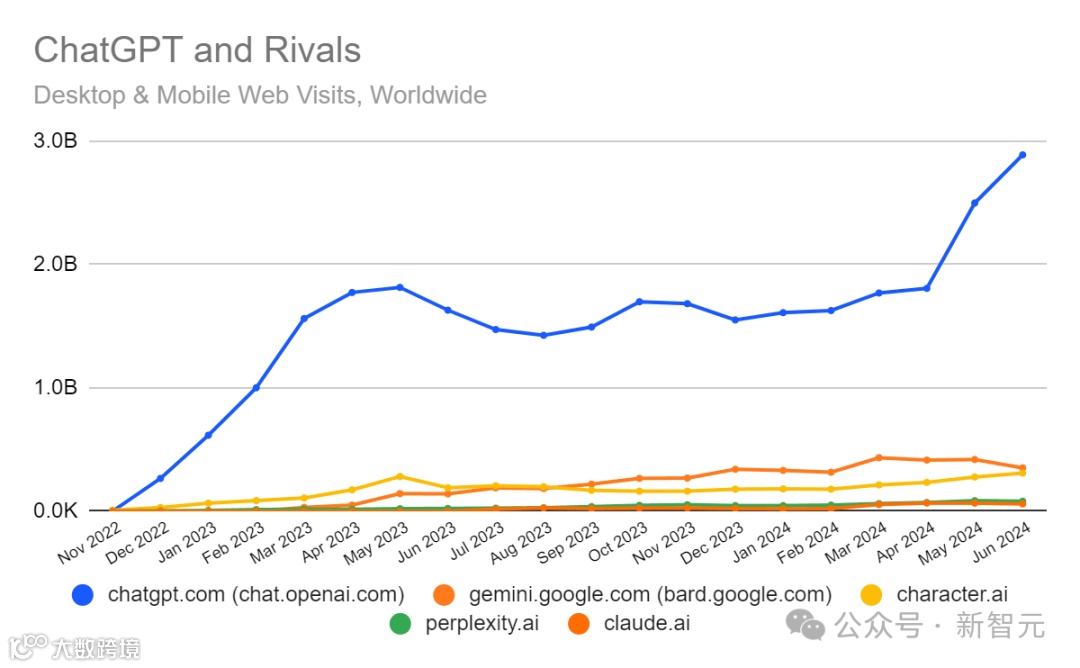 据Similarweb估计,ChatGPT在2024年6月创下了新的访问者记录。网站当月记录了29亿次访问量,比之前2024年5月的25亿次访问量记录增长了15.6%。
