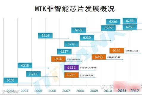 联发科(MTK)在移动领域CPU目前可以分为3个系列:1、MT62xx系列(功能手机);2、MT65xx系列(智能手机);3、MT83xx系列(平板)。下面我们先来介绍MT62xx系列(见下图):