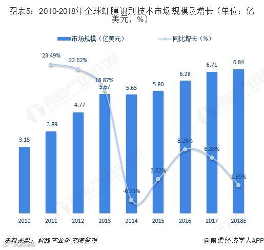 虹膜识别方面,虹膜识别作为生物特征识别的一个重要分支,是指利用人眼虹膜区域进行身份鉴别的技术,具有高稳定性、高可靠性和高防伪性等优点。但由于应用场景不多,当前发展不尽人意。2017年,全球虹膜识别技术规模还不到7亿美元。