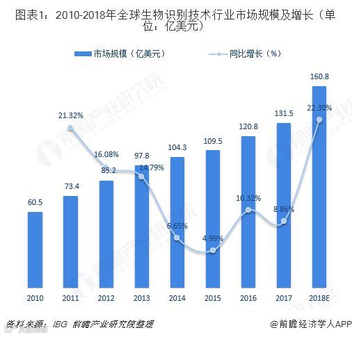 由于具备显著优势,生物识别技术开始在金融、电信、信息安全、电子政务等领域普及,全球生物识别技术行业市场规模不断扩张。根据IBG数据,2017年,全球生物识别市场的规模已达到约131.5亿美元,预计2018年市场规模在160.8亿美元左右。