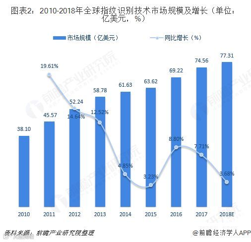 在各类生物识别技术中,指纹识别仍占据最高份额,但整体呈下降趋势,占比已从2007年的66.9%降至2017年的56.7%。指纹识别技术行业市场规模增长也逐渐放缓,2013年以后,同比增速回落至两位数以内。2017年,全球指纹识别技术(包括AFIS和非AFIS的指纹应用)规模约74.56亿美元,同比增长7.71%。