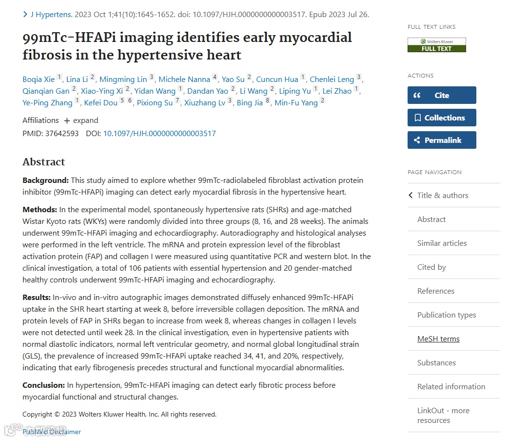 [1]Xie B, Li L, Lin M, Nanna M, Su Y, Hua C, Leng C, Gan Q, Xi XY, Wang Y, Yao D, Wang L, Yu L, Zhao L, Zhang YP, Dou K, Su P, Lv X, Jia B, Yang MF. 99mTc-HFAPi imaging identifies early myocardial fibrosis in the hypertensive heart. J Hypertens. 2023 Oct 1;41(10):1645-1652. doi: 10.1097/HJH.0000000000003517. Epub 2023 Jul 26. PMID: 37642593.