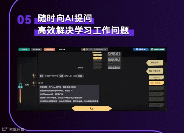 直播课上,老师会为你耐心讲解工作中常用的AI场景,并教你如何用提示词,让AI乖乖听你的话,成为你的工作小助理。