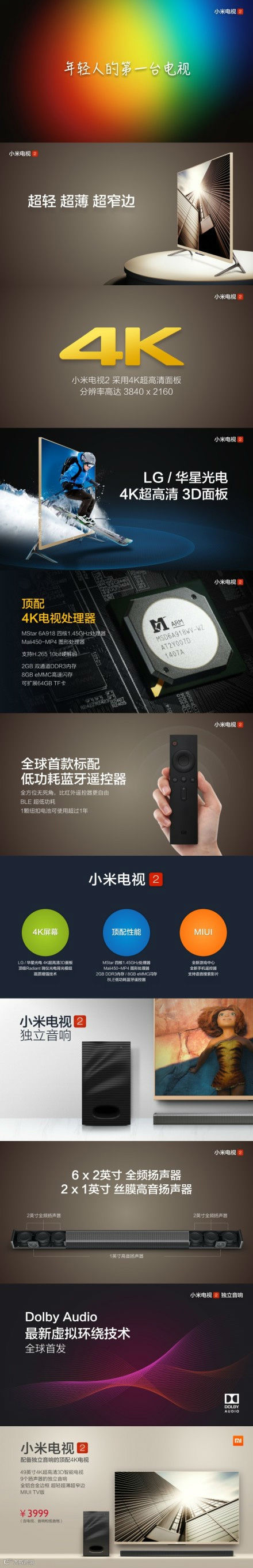 小米公司昨天(5月15日)下午在国家会议中心召开新品发布会,隆重发布了小米电视2代,配备了49英寸LG/华星光电的4K超高清3D面板,配备独立音响,售价为3999元。
