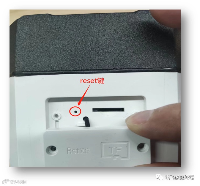 2、 卡针插入reset键里长按5s左右,设备会发出“复位成功”,摄像机重置成功,待提示“等待连接”,重新扫码绑定设备即可。
