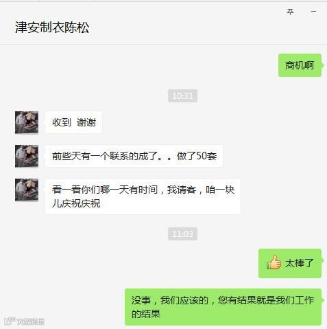 最终证明,我们的服务没有白费,来的商机精准度很高,大多都已经发了样品。在4月27日上午,陈总发来捷报,已经成交一笔订单,50套工作服。